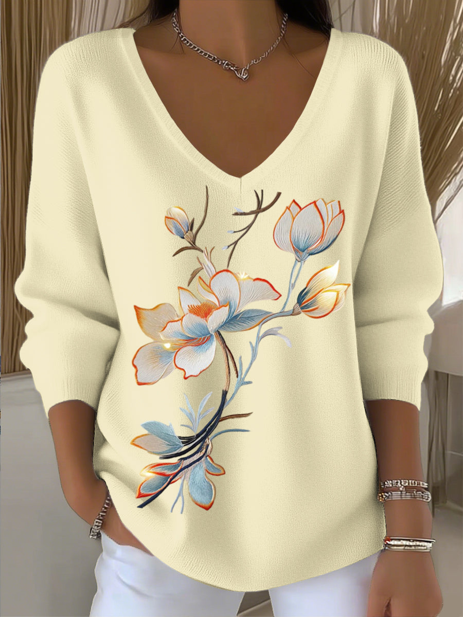 Дамски европейски стил светло жълт v-врата пуловер, сдвоен с очарователна флорална бродерия, модерна и комфортна, отговаряща на ежедневните нужди за носене
