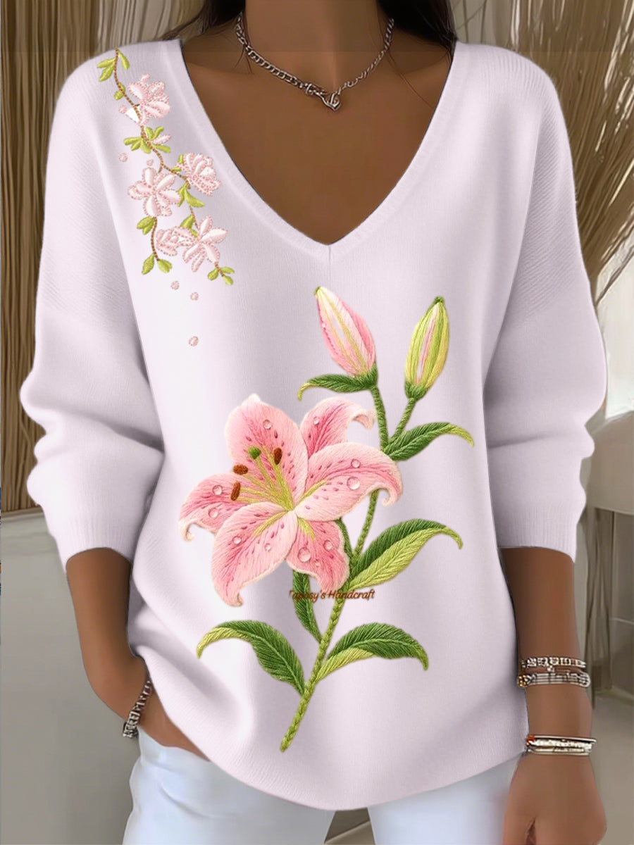 Дамски европейски стил светло розов пуловер с v-neck с красива лилия бродерия, класически и удобен, подходящ за различни ежедневни сцени