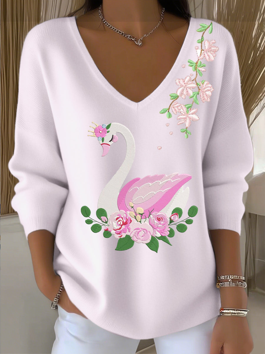 Дамски европейски стил светло розов пуловер v-neck с очарователна лебедова бродерия, модерен и удобен, лесен за създаване на дневен външен вид