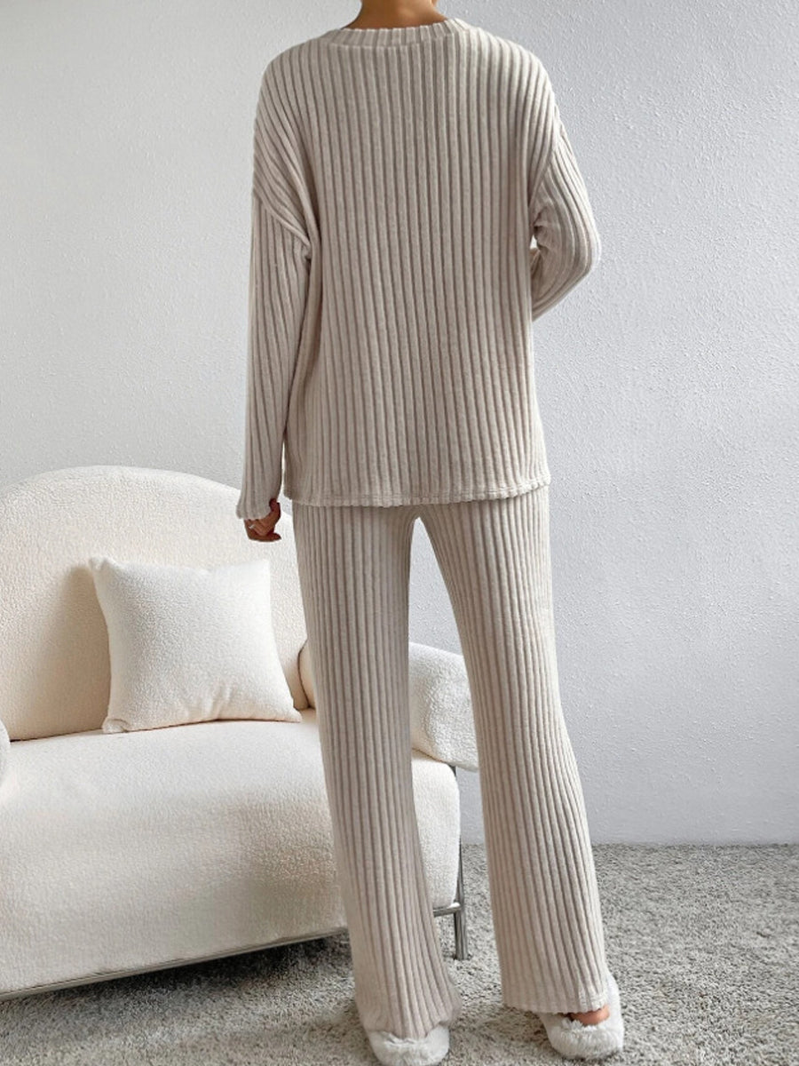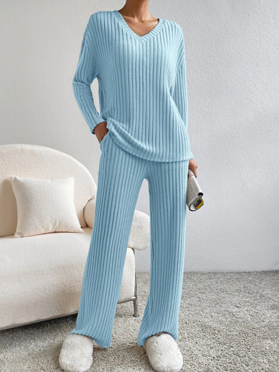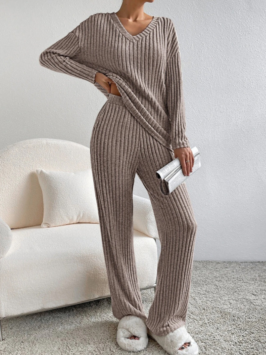 Дамски мода v-врата оребрени плетени прав крак панталон комплект