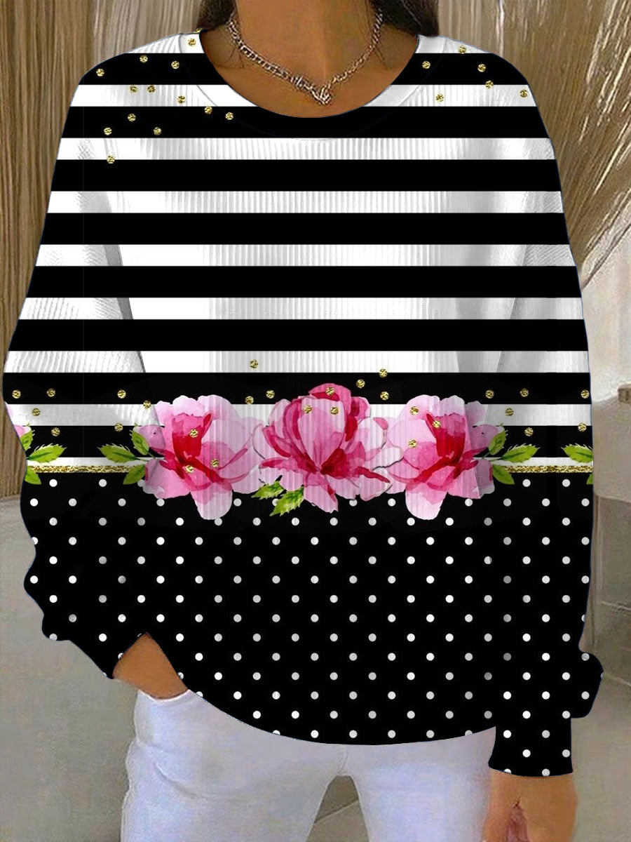 Дамски шик черно-бяла ивица & розов цветен суитчър