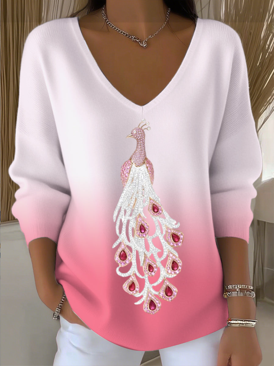 Жените бляскаво розово градиент v-врата суитчър с паун печат