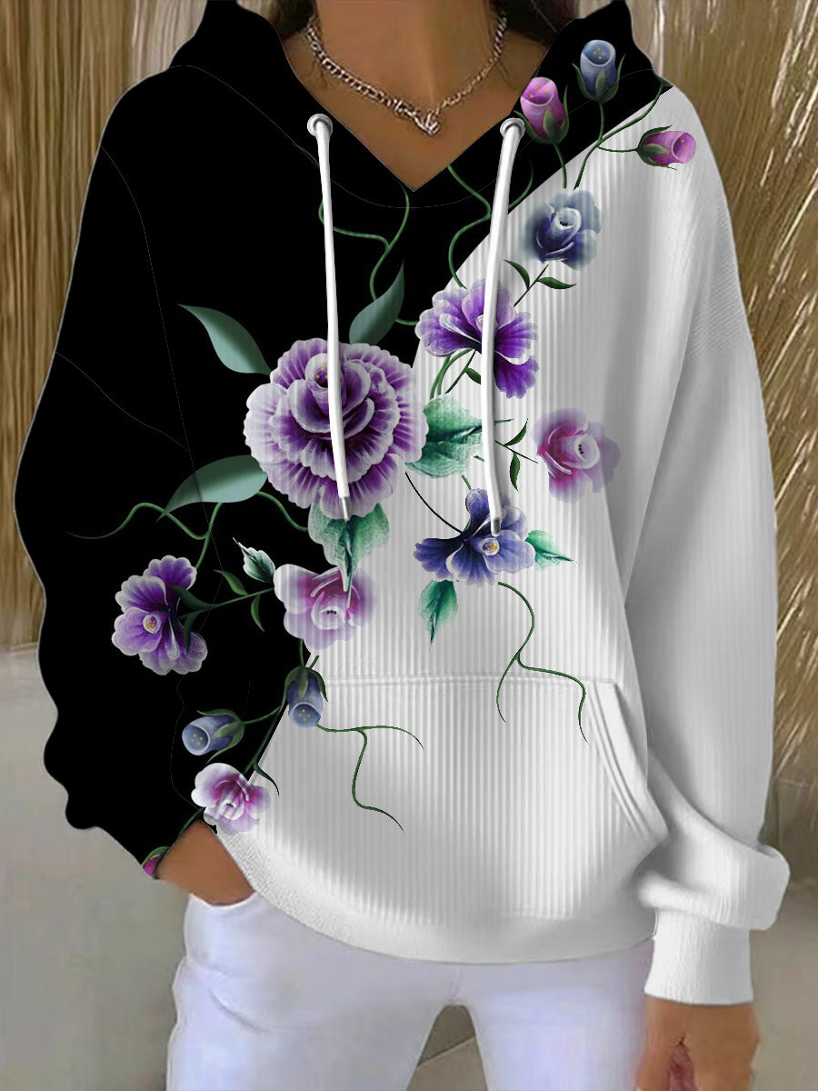 Жените елегантен лилаво цвете печат цвят-блок hoodie