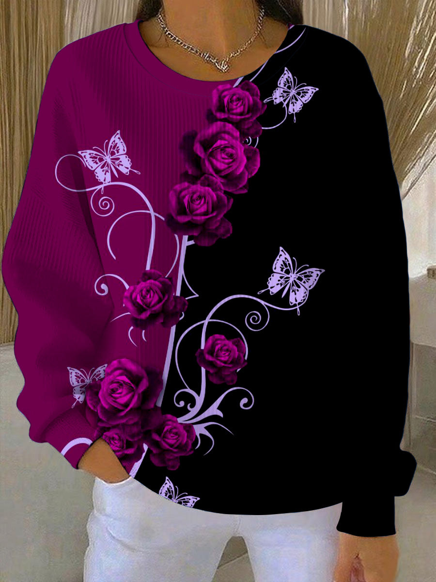 Зашеметяващ лилаво роза и пеперуда печат цвят-блок суитчър