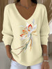Дамски европейски стил светло жълт v-врат пуловер, украсен с елегантна флорална бродерия, чист и хлабав, създавайки изискано ежедневно усещане